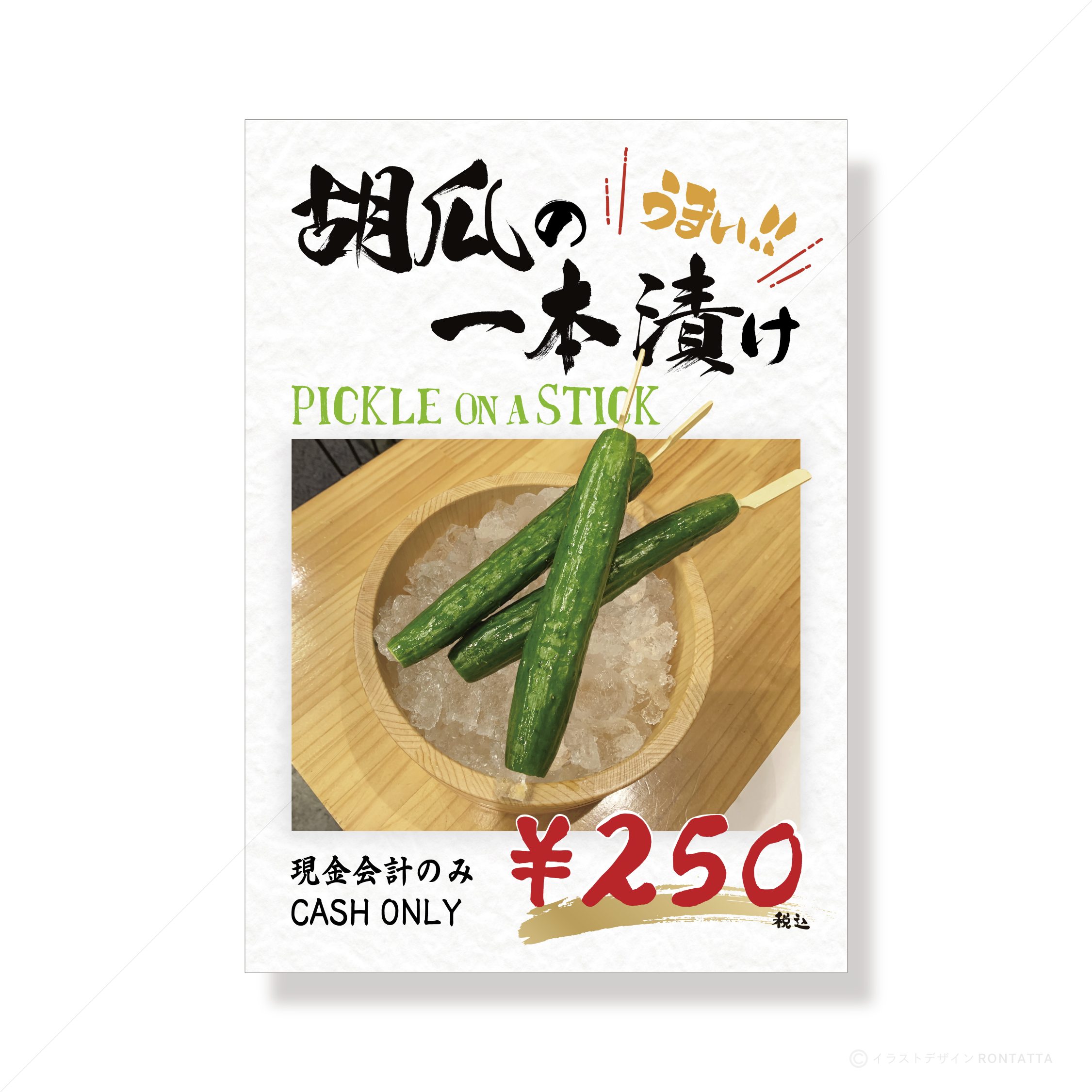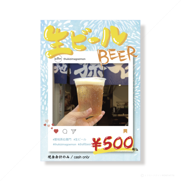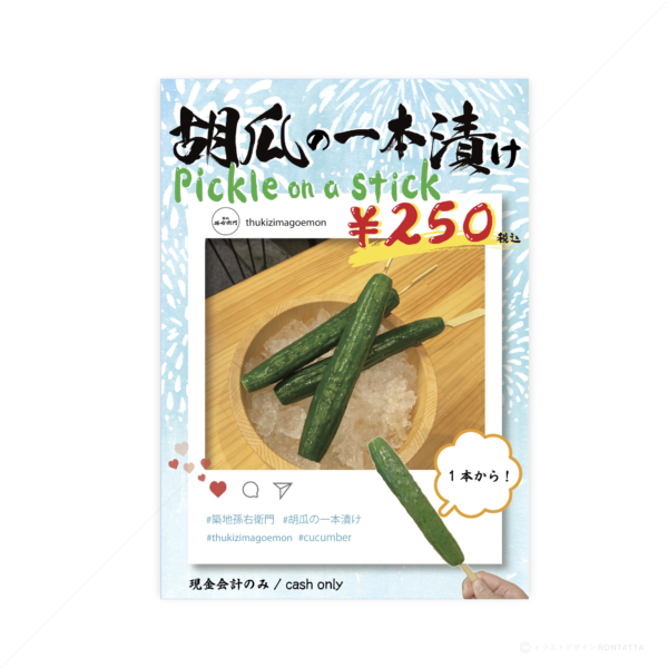 【POP制作】築地孫右衛門 本店様 築地孫右衛門 本店様のPOPメニューを制作いたしました。 店頭物販用のビール・きゅうり串それぞれ2パターンのご提案をさせていただきました。 この度もありがとうございました! – 納品形態 Ai.データ – 制作環境 MacBook Pro13 / Adobe Illustrator,Photoshop – CATEGORIESWORKS, デザイン
